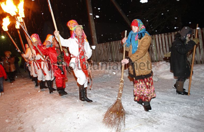 Ряженые участники колядного карнавала во время национального обряда ”Колядные цари” в деревне Семежево (Минская область, Беларусь), в четверг, 13 января 2011 г. Каждый год на Щедрый вечер в ночь с 13 на 14 января, группа из молодых мужчин – «царей» – с песнями и плясками проходят по деревне, посещают дома односельчан и разыгрывают действие о Царе Максимилиане. За это хозяева щедро одаривают гостей. Этот народный обряд зародился в XVIII веке, но сохранился только в деревне Семежево. В нём участвуют только молодые мужчины и юноши, которых и называют «царями». С наступлением темноты ”цари” зажигают факелы. Этот обряд входит в Список нематериального культурного наследия ЮНЕСКО. Фото Сергея Костина / УНИАН