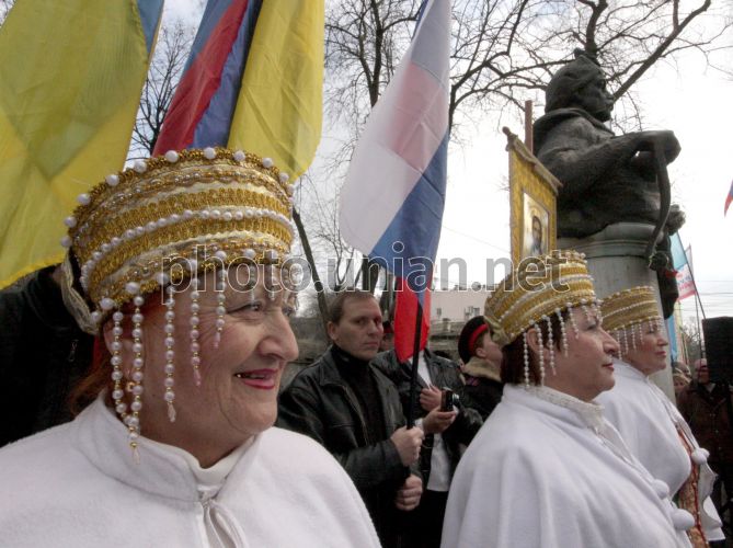 Участники торжественного митинга, посвящённого 357-й годовщине Переяславской Рады, возле памятника гетману Богдану Хмельницкому, в Симферополе (Крым), во вторник, 18 января 2011 года. Новацией празднования стало то, что оно впервые отмечается на республиканском уровне. Перед началом торжественного митинга благочинный Симферопольского района отец Николай отслужил литию «За вечную память гетмана Войска Запорожского Богдана Хмельницкого и его верных сподвижников». Затем представители общественности и российский генконсул возложили к памятнику гетмана цветы. Переяславская Рада – собрание представителей запорожского казачества во главе с Богданом Хмельницким, состоявшееся в январе 1654 года в Переяслав-Хмельницком, где было принято историческое решение о переходе Украины под покровительство царя московского Алексея Романова. Фото Алексея Сувирова / УНИАН
