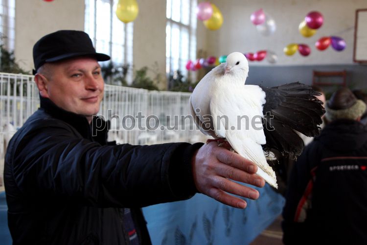 Участник Закарпатской областной выставки голубей демонстрирует свою птицу в Ужгороде, в субботу, 22 января 2011 г. На выставке, которая проходит 22-23 января, представлено около 300 голубей. Фото Яноша Немеша / УНИАН