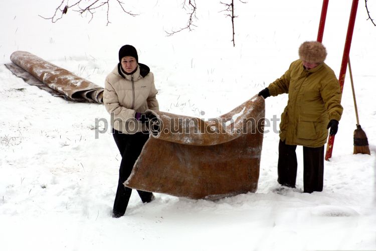 Женщины на снегу чистят ковёр, в Ужгороде, в среду, 26 январяя 2011 г. Фото Яноша Немеша / УНИАН