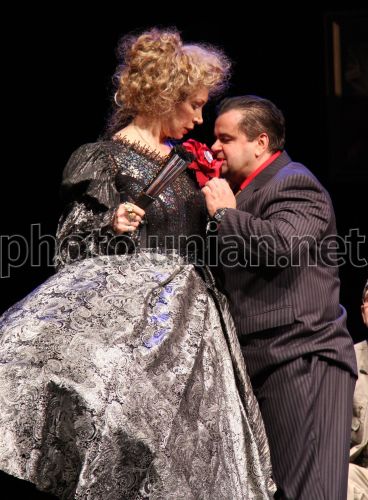 FILE Российские актеры Татьяна Васильева в роли Ольги Карловны и Сергей Рост в роли Персика Джумшутовича Бахчисяна играют в спектакле «Золотая мама или 13-я пуговица Наполеона», в Москве (Россия), в четверг, 29 октября 2008 г. 18 февраля 2011 г. в Киеве состоится показ комедии «Золотая мама или 13-я пуговица Наполеона». В основе спектакля - погоня за антикварными пуговицами. Татьяна Васильева играет мудрую еврейскую маму Ольгу Карловну, которая опекает своего 40-летнего сына, а Сергей Рост - Персика Джумшутовича Бахчисяна, отца, воспитывающего приемную дочь. Их взрослые дети влюблены друг в друга, и, чтобы помочь им быть вместе, Персик Бахчисян решил снять комнату в доме Ольги Карловны. Скоро выясняется, что Персик и Ольга – старые знакомые, и, будучи детьми, были безумно влюблены в друг друга, но признаться в своих чувствах так и не решились. Расставить все по местам помогла пуговица Наполеона – ценная реликвия, которая досталась Ольге Карловне по наследству. Фото предоставлено организаторами гастролей / УНИАН