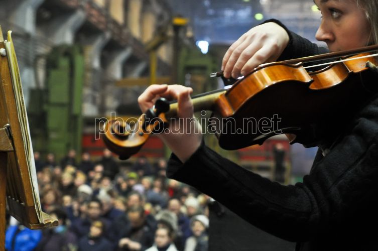 Музыкант Академического симфонического оркестра Харьковской областной филармонии играет на скрипке во время концерта в паротурбинном цехе ОАО "Турбоатом" в Харькове, в пятницу, 11 февраля 2011 г. Музыканты оркестра разместились прямо на продольно-фрезерном станке. При этом во время выступления над музыкантами двигался 200-тонный кран. Фото Игоря Чекачкова / УНИАН