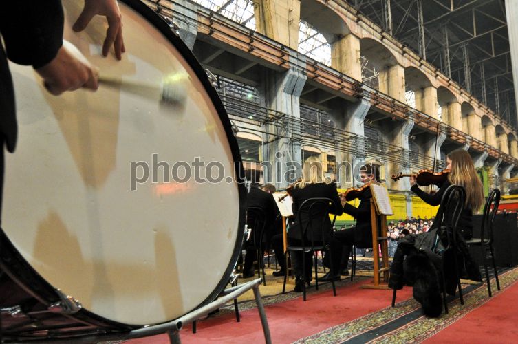 Музыканты Академического симфонического оркестра Харьковской областной филармонии выступают во время концерта в паротурбинном цехе ОАО "Турбоатом" в Харькове, в пятницу, 11 февраля 2011 г. Музыканты оркестра разместились прямо на продольно-фрезерном станке. При этом во время выступления над музыкантами двигался 200-тонный кран. Фото Игоря Чекачкова / УНИАН