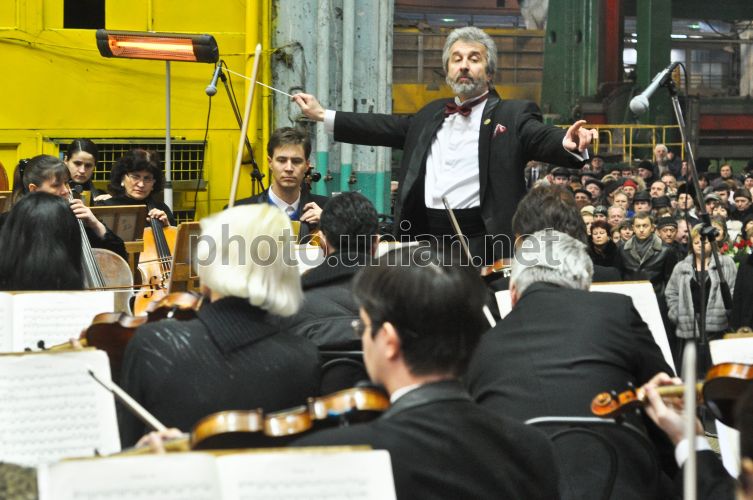 Музыканты Академического симфонического оркестра Харьковской областной филармонии выступают во время концерта в паротурбинном цехе ОАО "Турбоатом" в Харькове, в пятницу, 11 февраля 2011 г. Музыканты оркестра разместились прямо на продольно-фрезерном станке. При этом во время выступления над музыкантами двигался 200-тонный кран. Фото Игоря Чекачкова / УНИАН