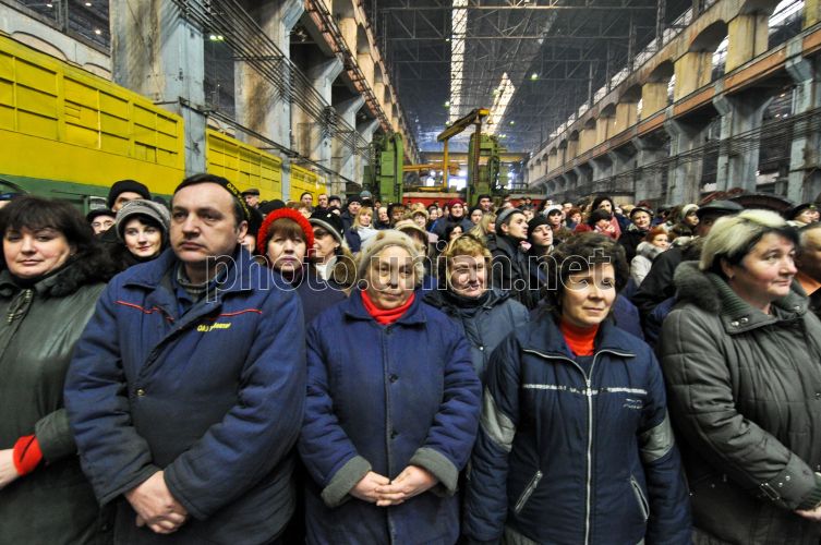 Работники ОАО "Турбоатом" во время концерта Академического симфонического оркестра Харьковской областной филармонии в паротурбинном цехе предприятия в Харькове, в пятницу, 11 февраля 2011 г. Музыканты оркестра разместились прямо на продольно-фрезерном станке. При этом во время выступления над музыкантами двигался 200-тонный кран. Фото Игоря Чекачкова / УНИАН