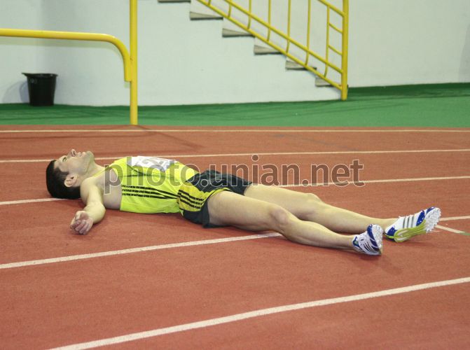 Участник Зимнего чемпионата Украины по легкой атлетике лежит на беговой дорожке после соревнования в Сумах, в среду, 16 февраля 2011 г. В соревнованиях, которые начались 15 февраля, принимают участие около 800 спортсменов из всех областей Украины, а также представители России и Беларуси. Чемпионат будет длиться на протяжении четырех дней. По его завершении будет сформирована сборная Украины, которая примет участие в первенстве Европы 4-6 марта в Париже. Фото Виталия Кохана / УНИАН