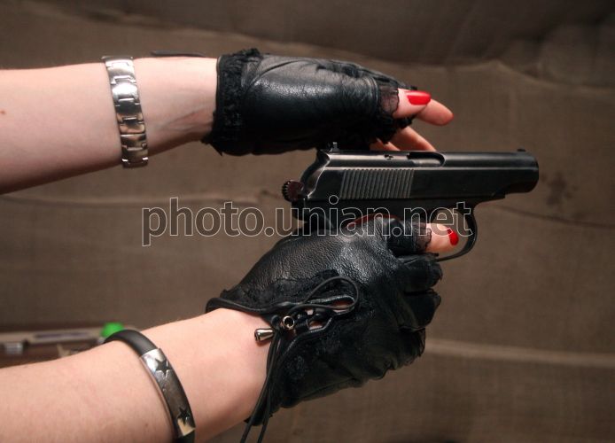 Девушка перезаряжает пистолет во время акции "Один день в армии, или госпожа-солдат" в Кировограде, в четверг, 3 марта 2011 г. Акция была проведена накануне Международного женского дня (8 марта). Цель акции - преодоление гендерных стереотипов в обществе и содействие достижению паритетного положения женщин и мужчин во всех сферах жизнедеятельности общества, в частности, в прохождении военной службы и повышении социального статуса женщины в ведомствах Вооруженных Сил Украины. Фото Олега Шрамко / УНИАН