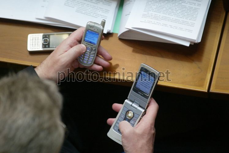 Народный депутат держит мобильные телефоны во время заседания Верховной Рады Украины, в Киеве, во вторник, 15 марта 2011 г. Во время пленарного заседания парламента председатель Верховной Рады Украины сообщил о том, что в ВРУ создано межфракционное объединение «Европейский выбор». По его словам, в состав объединения вошли 27 депутатов. Объединение создано с целью всестороннего и последовательного содействия политической ассоциации и экономической интеграции Украины в ЕС. Фото Андрея Скакодуба / УНИАН