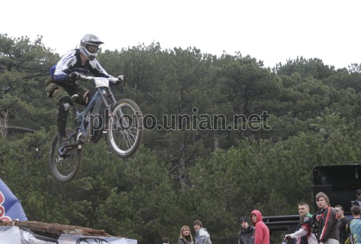 Участник Открытого кубка Украины по скоростному спуску «Горный велосипед» выполняет трюк, возле Ялты, в субботу, 2 апреля 2011 г. Фото Алексея Сувирова / УНИАН