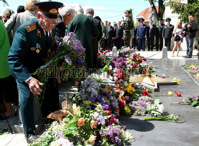 Ветеран Великой Отечественной войны возлагает цветы к Вечному Огню на Холме Славы во время празднования 66-й годовщины Победы, в Ужгороде, в понедельник, 9 мая 2011 г. Фото Яноша Немеша / УНИАН