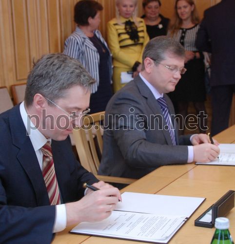 Директор фонда "Развитие Украины" Анатолий Заболотный, слева, и губернатор Днепропетровской области Александр Вилкул во время церемонии подписания меморандума в рамках реализации национального проекта "Развитие семейных форм воспитания" в Днепропетровске, в среду, 18 мая 2011 г. В этот день Днепропетровская облгосадминистрация и Благотворительный фонд Рината Ахметова "Развитие Украины" подписали меморандум в рамках реализации национального проекта "Развитие семейных форм воспитания". Днепропетровская обл. стала первой в Украине областью, подписавшей такой документ. В этом регионе проводится активная работа по развитию семейных форм воспитания - детских домов семейного типа (ДДСТ) и приемных семей. В настоящее время в Днепропетровской обл. функционирует 42 детских дома семейного типа и 255 приемных семей, где воспитываются 724 ребенка. В 2009 г. в ДДСТ и приемных семьях воспитывалось 6,1% детей-сирот и детей, лишенных родительской заботы, от их общего количества. В 2010 г. этот показатель вырос до 7,2%. По словам губернатора области, подписание меморандума даст новый толчок к реформированию системы интернатных заведений области для детей-сирот и детей, лишенных родительской заботы. В свою очередь, директор фонда "Развитие Украины" отметил, что семейные ценности - приоритет для фонда. "В последние годы Украина демонстрирует явный прорыв в вопросе устройства детей-сирот в семью - в 2010 году национальное усыновление значительно превысило иностранное (для сравнения: в 2005 году украинцы усыновили 1479 детей, иностранцы – 2400, а через 5 лет за границу выехало 1240 детей, а украинские семьи взяли в воспитание 2380 детей из интернатных заведений). Однако проблема не решена – в Украине более 100 тысяч детей-сирот", – отметил директор фонда. Он выразил надежду, что в Днепропетровской обл. эта проблема в ближайшее время будет решена - фонд вместе с облгосадминистрацией, общественными организациями, независимыми экспертами, представителями государственных органов разработает для области стратегию реформирования интернатных заведений и будет содействовать развитию семейных форм воспитания. Фото Максима Швеца / УНИАН