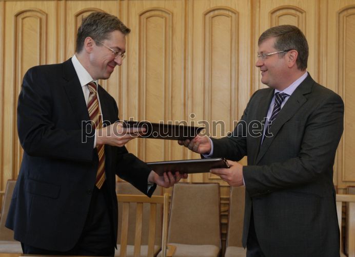 Директор фонда "Развитие Украины" Анатолий Заболотный, слева, и губернатор Днепропетровской области Александр Вилкул обмениваются документами во время церемонии подписания меморандума в рамках реализации национального проекта "Развитие семейных форм воспитания" в Днепропетровске, в среду, 18 мая 2011 г. В этот день Днепропетровская облгосадминистрация и Благотворительный фонд Рината Ахметова "Развитие Украины" подписали меморандум в рамках реализации национального проекта "Развитие семейных форм воспитания". Днепропетровская обл. стала первой в Украине областью, подписавшей такой документ. В этом регионе проводится активная работа по развитию семейных форм воспитания - детских домов семейного типа (ДДСТ) и приемных семей. В настоящее время в Днепропетровской обл. функционирует 42 детских дома семейного типа и 255 приемных семей, где воспитываются 724 ребенка. В 2009 г. в ДДСТ и приемных семьях воспитывалось 6,1% детей-сирот и детей, лишенных родительской заботы, от их общего количества. В 2010 г. этот показатель вырос до 7,2%. По словам губернатора области, подписание меморандума даст новый толчок к реформированию системы интернатных заведений области для детей-сирот и детей, лишенных родительской заботы. В свою очередь, директор фонда "Развитие Украины" отметил, что семейные ценности - приоритет для фонда. "В последние годы Украина демонстрирует явный прорыв в вопросе устройства детей-сирот в семью - в 2010 году национальное усыновление значительно превысило иностранное (для сравнения: в 2005 году украинцы усыновили 1479 детей, иностранцы – 2400, а через 5 лет за границу выехало 1240 детей, а украинские семьи взяли в воспитание 2380 детей из интернатных заведений). Однако проблема не решена – в Украине более 100 тысяч детей-сирот", – отметил директор фонда. Он выразил надежду, что в Днепропетровской обл. эта проблема в ближайшее время будет решена - фонд вместе с облгосадминистрацией, общественными организациями, независимыми экспертами, представителями государственных органов разработает для области стратегию реформирования интернатных заведений и будет содействовать развитию семейных форм воспитания. Фото Максима Швеца / УНИАН