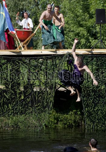 Участники Всеукраинских соревнований по традиционным славянским боевым видам единоборств "Игры чубатых славян" сбрасывают друг друга в воду на территории музея под открытым небом "Мамаева Слобода" в Киеве, в субботу, 27 мая 2011 г. Лучшие бойцы Украины из Донецка (Слободчане), Львова (Левунцы), Симферополя (Степовики) и Киева (Надднепрянцы) будут бороться между собой "стенка на стенку" и один на один, пытаясь сбросить противника с острова в воду. Побежденные обязательно будут сброшены в озеро и на острове сможет остаться только самая сильная команда борцов "чубатых славян" с Юга, Запада, Центра или Востока Украины. Фото Алексея Чернышова / УНИАН