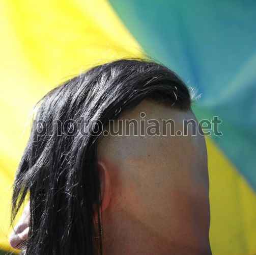 Участник Всеукраинских соревнований по традиционным славянским боевым видам единоборств "Игры чубатых славян" с прической-оселедцем на территории музея под открытым небом "Мамаева Слобода" в Киеве, в субботу, 27 мая 2011 г. Лучшие бойцы Украины из Донецка (Слободчане), Львова (Левунцы), Симферополя (Степовики) и Киева (Надднепрянцы) будут бороться между собой "стенка на стенку" и один на один, пытаясь сбросить противника с острова в воду. Побежденные обязательно будут сброшены в озеро и на острове сможет остаться только самая сильная команда борцов "чубатых славян" с Юга, Запада, Центра или Востока Украины. Фото Алексея Чернышова / УНИАН