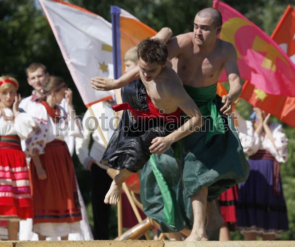 Участники Всеукраинских соревнований по традиционным славянским боевым видам единоборств "Игры чубатых славян" пытаются сбросить друг друга в воду на территории музея под открытым небом "Мамаева Слобода" в Киеве, в субботу, 27 мая 2011 г. Лучшие бойцы Украины из Донецка (Слободчане), Львова (Левунцы), Симферополя (Степовики) и Киева (Надднепрянцы) будут бороться между собой "стенка на стенку" и один на один, пытаясь сбросить противника с острова в воду. Побежденные обязательно будут сброшены в озеро и на острове сможет остаться только самая сильная команда борцов "чубатых славян" с Юга, Запада, Центра или Востока Украины. Фото Алексея Чернышова / УНИАН