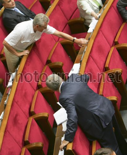 Народные депутаты голосуют вместо своих коллег во время заседания Верховной Рады Украины, в Киеве, в четверг, 7 июля 2011 г. Верховная Рада начала рассмотрение во втором чтении проекта закона о мерах по законодательному обеспечению реформирования пенсионной системы. Во время рассмотрения председатель Комитета ВР по делам пенсионеров, ветеранов и инвалидов отметил, что к проекту закона были поданы 1179 поправок. По его словам, 528 поправок были учтены полностью или частично, а 651 отклонены. В ложе правительства находится вице-премьер-министр Украины - министр социальной политики. Народный депутат от КПУ Евгений Царьков установил перед ним небольшой плакат с изображением креста, под которым написано: «За социальный фашизм». Фото Андрея Скакодуба / УНИАН