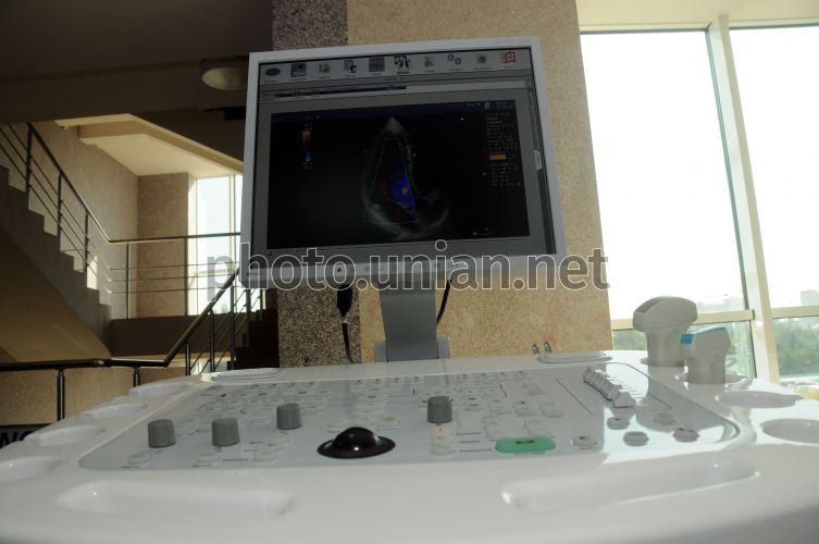 Аппарат УЗИ на выставке медицинского оборудования на территории на НИИ радиотехнических измерений «Радмир», в Харькове, во вторник, 30 августа 2011 г. После посещения харьковского производителя медтехники премьер-министр заявил, что Кабмин Украины в 2012 году закупит медицинскую аппаратуру у харьковского предприятия «НИИ радиотехнических измерений «Радмир». В ходе визита на предприятие премьер осмотрел самые современные образцы медицинской техники, которая изготовляется в Харькове с применением нанотехнологий, в частности, новейший диагностический аппарат «Магнитерм». Фото Владимира Андреева / УНИАН