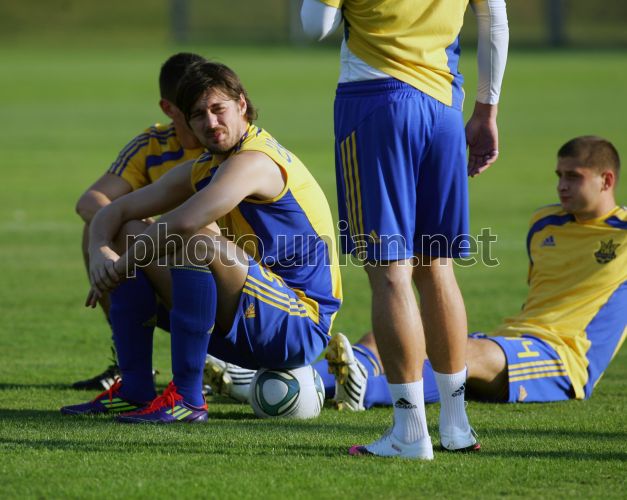Нападающий национальной сборной команды Украины по футболу Артем Милевский (слева) во время открытой тренировки, на учебно-тренировочной базе в Конча-Заспе, во вторник, 30 августа 2011 г. Фото Андрея Скакодуба / УНИАН