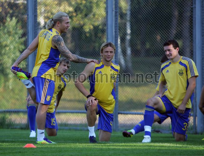 Игроки национальной сборной Украины по футболу Анатолий Тимощук (в центре) и Андрей Воронин (слева) во время открытой тренировки, на учебно-тренировочной базе в Конча-Заспе, во вторник, 30 августа 2011 г. Фото Андрея Скакодуба / УНИАН