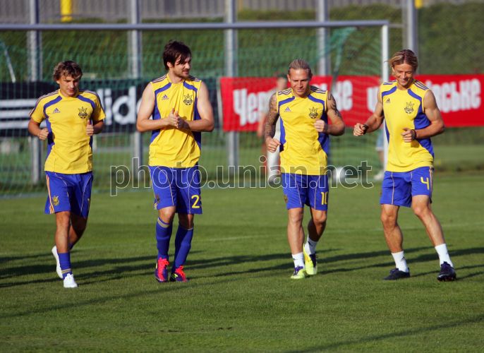 Справа налево - игроки национальной сборной Украины по футболу Анатолий Тимощук, Андрей Воронин и Артем Милевский во время открытой тренировки, на учебно-тренировочной базе в Конча-Заспе, во вторник, 30 августа 2011 г. Фото Андрея Скакодуба / УНИАН