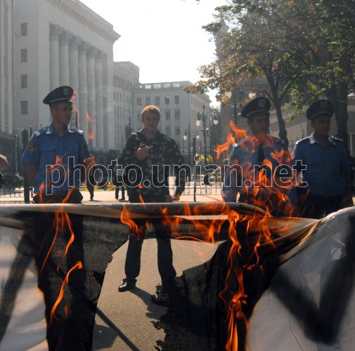 Сотрудники милиции смотрят на горящий плакат во время акции Комитета освобождения политзаключенных против противоправных действий силовых структур под Администрацией Президента, в Киеве, в среду, 31 августа 2011 г. В этот день возле Администрации Президента Украины Комитет освобождения политзаключенных провел акцию против противоправных действий силовых структур. В акции приняли участие около 100 человек, которые пытались передать Президенту Украины белую коробку с надписью «Огнеопасно», в которой были яйца и венок. По мнению организаторов акции, именно этих вещей «боится Президент». Кроме того, участники акции зажгли у ворот Администрации Президента дымовую шашку. В результате правоохранительные органы составили административный протокол в отношении одного из организаторов этой акции Николая Кохановского. Также участники акции обнародовали обращение к общественным организациям, политическим партиям и небезразличным гражданам с призывом поддержать защиту тех людей, которые не боятся выступать против действующей власти. Фото Олега Петрасюка / УНИАН