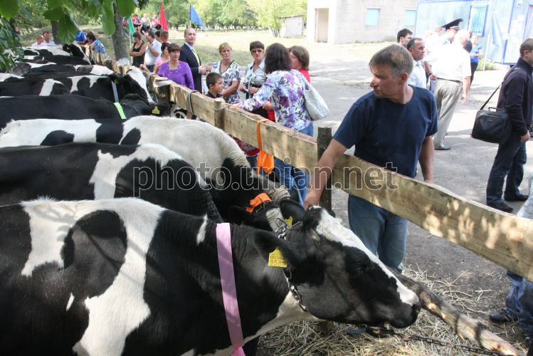 Коровы, в с. Андреевка (Покровский р-н, Днепропетровская обл.), в среду, 7 сентября 2011 г. В этот день на сельскохозяйственном обслуживающем кооперативе (СОК) «Благосостояние Андреевки» состоялось официальное открытие пункта сбора и охлаждения молока СОК с вручением членам-владельцам личных сельских хозяйств первой партии племенных нетелей. Мероприятие проводился в рамках проекта «Развитие молочарских кооперативов». Фото Сергея Исаева / УНИАН