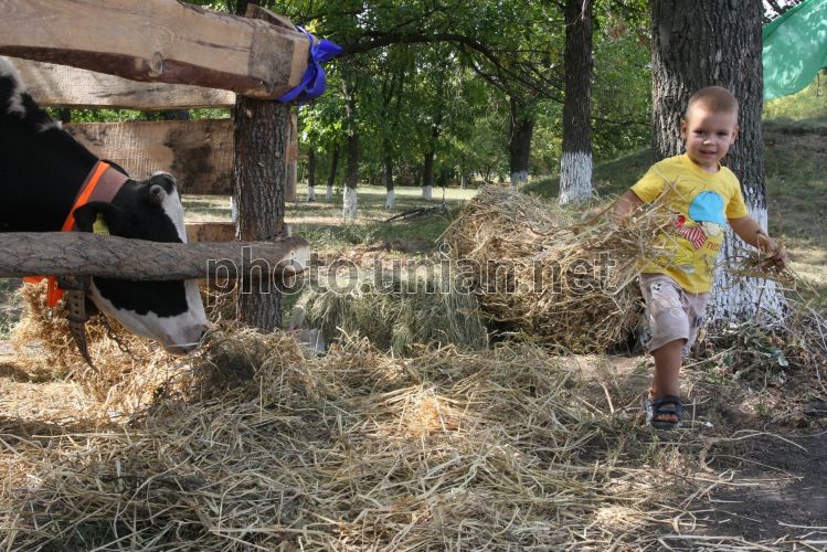 Маленький мальчик несет сено, в с. Андреевка (Покровский р-н, Днепропетровская обл.), в среду, 7 сентября 2011 г. В этот день на сельскохозяйственном обслуживающем кооперативе (СОК) «Благосостояние Андреевки» состоялось официальное открытие пункта сбора и охлаждения молока СОК с вручением членам-владельцам личных сельских хозяйств первой партии племенных нетелей. Мероприятие проводился в рамках проекта «Развитие молочарских кооперативов». Фото Сергея Исаева / УНИАН