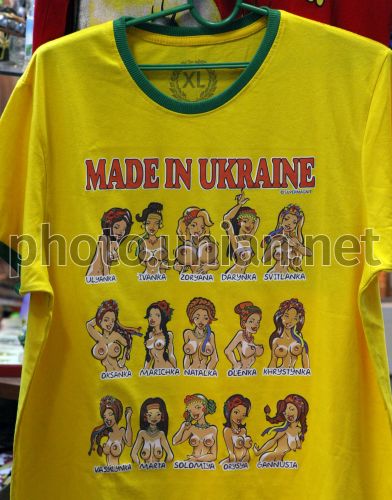 Футболка с изображением обнаженных по пояс девушек и надписью "Made in Ukraine" на одном из торговых прилавков в центре Киева, во вторник, 13 сентября 2011 г. Фото Владимира Гонтара / УНИАН