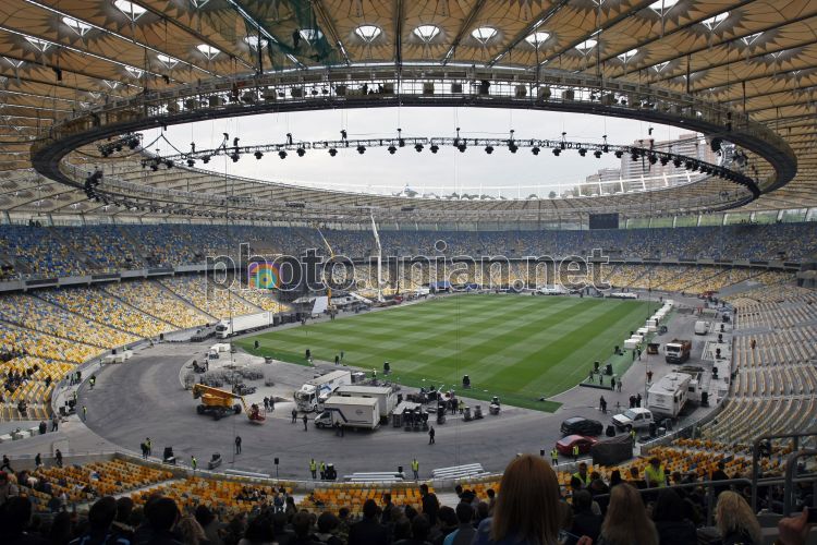 Последние приготовления НСК «Олимпийский» во время проведения подготовки к открытию стадиона в Киеве, во вторник, 4 октября 2011 г. Торжественное открытие реконструированного НСК «Олимпийский» состоится в субботу 8 октября. Фото Андрея Скакодуба / УНИАН