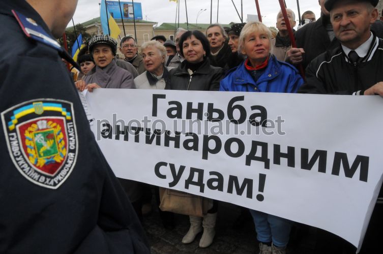 Участники митинга сторонников партии "БЮТ-Батькивщина" против преследования экс-премьер-министра Украины Юлии Тимошенко держат плакат, в Харькове, в пятницу, 14 октября 2011 г. Фото Владимира Андреева / УНИАН
