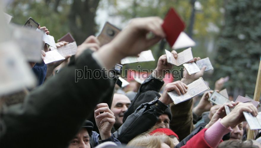 Участники акции протеста держат удостоверения личностей, которые пострадали в результате Чернобыльской катастрофы возле здания Верховной Рады Украины, в Киеве, во вторник, 1 ноября 2011 г. Около 700 человек пикетируют Верховную Раду, выступая против отмены льгот чернобыльцам. Все двери в Верховную Раду закрыты, и в здание парламента никого не пускают. Участникам акции протеста удалось прорвать в нескольких местах забор. Представители чернобыльских и афганских организаций подошли вплотную к зданию парламента. Бойцам спецподразделения МВД «Беркут» удалось оттеснить чернобыльцев, которые сделали очередную попытку прорваться в здание парламента, на несколько метров от входов в Верховную Раду. Таким образом, стражи порядка создали небольшую площадку вдоль колоннады здания. При этом митингующие выкрикивают в адрес стражей порядка, что настоящий протест те увидят через два дня, когда в Киев приедут представители афганских организаций. Фото Андрея Скакодуба / УНИАН