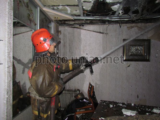 Пожарник тушит одну из квартир в жилом доме барачного типа в Ильичевском р-не Мариуполя (Донецкая обл.), в субботу, 12 ноября 2011 г. В этот день, около 15 часов в Мариуполе загорелся дом. По предварительным данным, никто из жильцов не пострадал. К месту происшествия выехали 4 пожарных расчета СГПЧ-25 и аварийно-спасательные машины МЧС. Работу спасателей затрудняло то, что район, в котором находится дом, - безводный, то есть там негде пополнить запас воды в автоцистернах. Борьба с огнем длилась несколько часов. В результате из 11 квартир жилого дома пожарным удалось спасти только 2. Остальные 9 сгорели дотла. Около 20 человек остались без крова. Причина пожара устанавливается. Фото Николая Рябченко / УНИАН