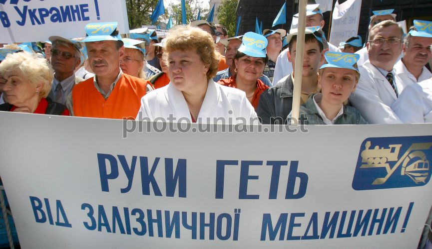 COMM Железнодорожники пикетируют здание Кабинета Министров Украины во время акции протеста в Киеве в пятницу, 16 июня 2006 г. Они протестуют против передачи отраслевых медицинских и учебных заведений в подчинение Министерству здравоохранения и Министерству образования и науки Украины и прекращения их финансирования из госбюджета, изъятия в госбюджет 50% чистой прибыли железных дорог и лишения работников и пенсионеров льгот и социальных гарантий, установленных Отраслевым соглашением и коллективными договорами железных дорог. Фото Александра Синицы / УНИАН