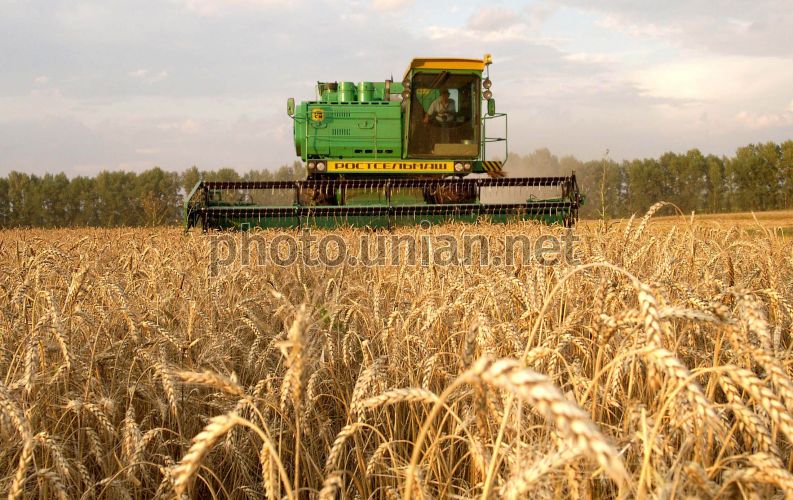COMM АРХИВ УНИАН Комбайн производства Харьковского завода им. Малышева косит пшеницу в Шевченковском районе Харьковской области в июле 2005 г. Фото Андрея Мариенко / УНИАН