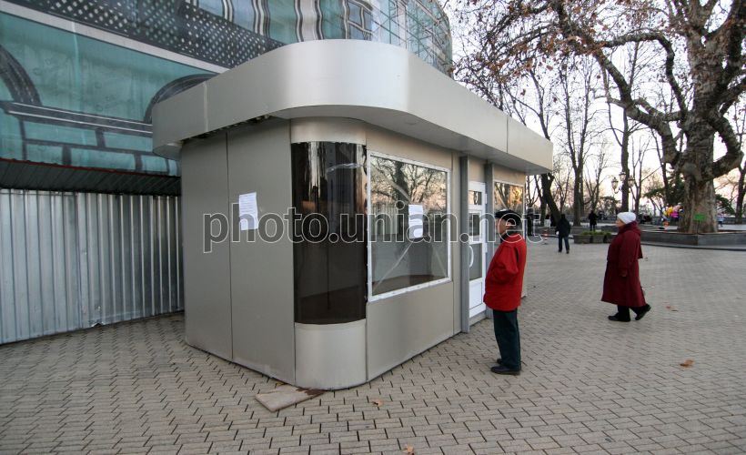 Торговый павильон перед зданием Одесского городского совета, в Одессе, 28 декабря 2011 г. В этот день на Думской площади появился торговый ларёк площадью 18 кв. м. Вскоре к горсовету приехали эвакуаторы, которые попытались убрать торговое помещение. Как оказалось, торговую точку к зданию горсовета перевёз депутат одесского городского совета Александр Шеремет, который сообщил, что соответствующие городские органы игнорировали его обращения о необходимости сноса подобных незаконных строений с остановок общественного транспорта, поэтому он решил привлечь их внимание к этой проблеме таким радикальным образом. Фото Александра Гиманова / УНИАН