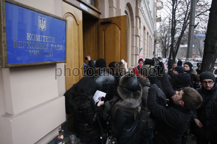 Участники акции протеста против принятия закона о высшем образовании пытаются пройти в здание Комитета Верховной Рады Украины, в Киеве, во вторник, 10 января 2012 г. В этот день около 50 участников пикета вошли в здание по адресу: ул. Грушевского, 18/2, где проходило заседание Согласительного совета председателей фракций и руководителей парламентских комитетов. Охрана парламента не пропустила их за рамку, стоящую на входе в здание. Молодые люди принесли небольшую коробку, перевязанную бантом, как подарок народным депутатам. Охрана вытесняла студентов из здания, но они хотели пообщаться с депутатами. Участники пикета выкрикивали: «Депутаты, идите к нам», «Луцкий (председатель Комитета ВР по вопросам образования – УНИАН), иди сюда». Время от времени между молодыми людьми и охранниками возникала толкотня. Фото УНИАН