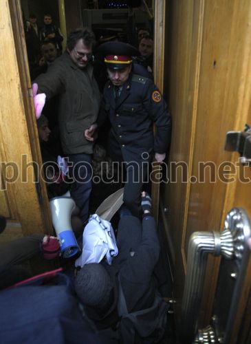 Сотрудник милиции вытесняет из здания Верховной Рады пикетирующих, выступающих против принятия закона о высшем образовании, в Киеве, во вторник, 10 января 2012 г. В этот день около 50 участников пикета вошли в здание по адресу: ул. Грушевского, 18/2, где проходило заседание Согласительного совета председателей фракций и руководителей парламентских комитетов. Охрана парламента не пропустила их за рамку, стоящую на входе в здание. Молодые люди принесли небольшую коробку, перевязанную бантом, как подарок народным депутатам. Охрана вытесняла студентов из здания, но они хотели пообщаться с депутатами. Участники пикета выкрикивали: «Депутаты, идите к нам», «Луцкий (председатель Комитета ВР по вопросам образования – УНИАН), иди сюда». Время от времени между молодыми людьми и охранниками возникала толкотня. Фото УНИАН