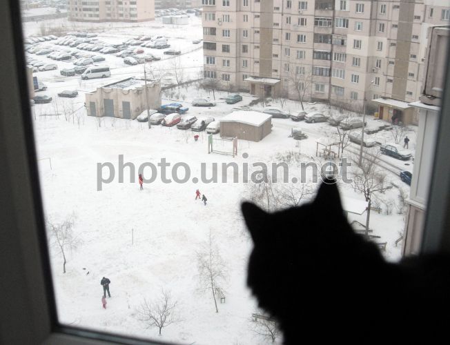 Черный кот смотрит в окно, в Киеве, в воскресенье, 15 января 2012 г. В этот день в Украине прошел снег, днем в западных областях умеренный. Температура ночью 0-5° мороза, днем от 3° мороза до 2° тепла, в Карпатах на протяжении суток 5-10° мороза. В Киеве температура ночью 1-3° мороза, днем около 0°. Фото Олега Петрасюка / УНИАН