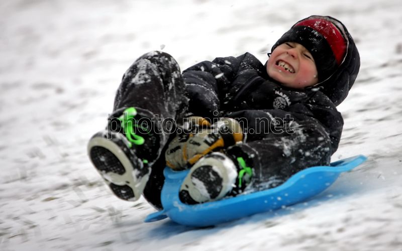 Мальчик катается на санках, в Киеве, в воскресенье, 15 января 2012 г. В этот день в Украине прошел снег, днем в западных областях умеренный. Температура ночью 0-5° мороза, днем от 3° мороза до 2° тепла, в Карпатах на протяжении суток 5-10° мороза. В Киеве температура ночью 1-3° мороза, днем около 0°. Фото Александра Синицы / УНИАН