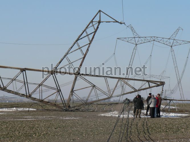 Сотрудники оперативной группы расследуют преступление на месте падения опора магистральной линии ВП-750 кВ «ЗАЭС-Южнодонбасская» в районе с. Качкаровка (Великобелозерский район, Запорожская область), 26 января 2012 г. Сотрудники правоохранительных органов задержали троих мужчин, которые 27 января в Великобелозерском районе Запорожской области в районе села Качкаровка разобрали металлическую конструкцию электроопоры. Тогда в ходе проверки было установлено, что на опоре № 77 (а также на двух соседних) частично отсутствуют металлические уголки и степ-болты, из-за чего опора упала на землю, что привело к короткому замыканию электросети и снижению мощности атомной станции на 40 МВт. Никто не пострадал, на общее состояние электроснабжения это не повлияло, перебоя в подаче электричества к пользователям не было. Для расследования этого преступления правоохранители создали усиленную следственно-оперативную группу, которая оперативно установила личности подозреваемых в совершении преступления: троих местных жителей 1986, 1987 и 1978 года рождения. В отношении задержанных следственным управлением ГУМВД Украины в Запорожской области возбуждено уголовное дело по признакам преступления, предусмотренного ч.2 ст. 194 -1 УК Украины «Умышленное повреждение объектов электроэнергетики». Фото предоставлено главным инженером Национальной энергетической компании «Укрэнерго» Днепровской энергетической системы «Запорожские магистральные сети» Василием Федорончаком / УНИАН