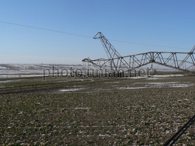 Упавшая опора магистральной линии ВП-750 кВ «ЗАЭС-Южнодонбасская» в районе с. Качкаровка (Великобелозерский район, Запорожская область), 27 января 2012 г. Сотрудники правоохранительных органов задержали троих мужчин, которые 27 января в Великобелозерском районе Запорожской области в районе села Качкаровка разобрали металлическую конструкцию электроопоры. Тогда в ходе проверки было установлено, что на опоре № 77 (а также на двух соседних) частично отсутствуют металлические уголки и степ-болты, из-за чего опора упала на землю, что привело к короткому замыканию электросети и снижению мощности атомной станции на 40 МВт. Никто не пострадал, на общее состояние электроснабжения это не повлияло, перебоя в подаче электричества к пользователям не было. Для расследования этого преступления правоохранители создали усиленную следственно-оперативную группу, которая оперативно установила личности подозреваемых в совершении преступления: троих местных жителей 1986, 1987 и 1978 года рождения. В отношении задержанных следственным управлением ГУМВД Украины в Запорожской области возбуждено уголовное дело по признакам преступления, предусмотренного ч.2 ст. 194 -1 УК Украины «Умышленное повреждение объектов электроэнергетики». Фото предоставлено главным инженером Национальной энергетической компании «Укрэнерго» Днепровской энергетической системы «Запорожские магистральные сети» Василием Федорончаком / УНИАН