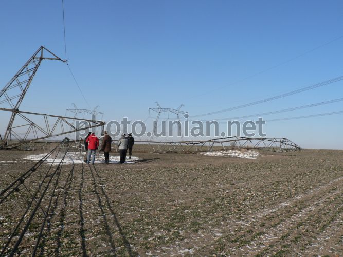Сотрудники оперативной группы расследуют преступление на месте падения опора магистральной линии ВП-750 кВ «ЗАЭС-Южнодонбасская» в районе с. Качкаровка (Великобелозерский район, Запорожская область), 26 января 2012 г. Сотрудники правоохранительных органов задержали троих мужчин, которые 27 января в Великобелозерском районе Запорожской области в районе села Качкаровка разобрали металлическую конструкцию электроопоры. Тогда в ходе проверки было установлено, что на опоре № 77 (а также на двух соседних) частично отсутствуют металлические уголки и степ-болты, из-за чего опора упала на землю, что привело к короткому замыканию электросети и снижению мощности атомной станции на 40 МВт. Никто не пострадал, на общее состояние электроснабжения это не повлияло, перебоя в подаче электричества к пользователям не было. Для расследования этого преступления правоохранители создали усиленную следственно-оперативную группу, которая оперативно установила личности подозреваемых в совершении преступления: троих местных жителей 1986, 1987 и 1978 года рождения. В отношении задержанных следственным управлением ГУМВД Украины в Запорожской области возбуждено уголовное дело по признакам преступления, предусмотренного ч.2 ст. 194 -1 УК Украины «Умышленное повреждение объектов электроэнергетики». Фото предоставлено главным инженером Национальной энергетической компании «Укрэнерго» Днепровской энергетической системы «Запорожские магистральные сети» Василием Федорончаком / УНИАН