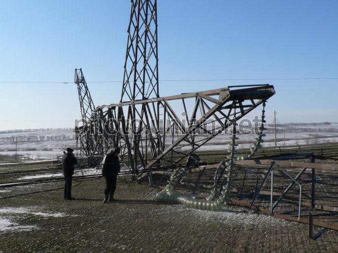 Упавшая опора магистральной линии ВП-750 кВ «ЗАЭС-Южнодонбасская» в районе с. Качкаровка (Великобелозерский район, Запорожская область), 27 января 2012 г. Сотрудники правоохранительных органов задержали троих мужчин, которые 27 января в Великобелозерском районе Запорожской области в районе села Качкаровка разобрали металлическую конструкцию электроопоры. Тогда в ходе проверки было установлено, что на опоре № 77 (а также на двух соседних) частично отсутствуют металлические уголки и степ-болты, из-за чего опора упала на землю, что привело к короткому замыканию электросети и снижению мощности атомной станции на 40 МВт. Никто не пострадал, на общее состояние электроснабжения это не повлияло, перебоя в подаче электричества к пользователям не было. Для расследования этого преступления правоохранители создали усиленную следственно-оперативную группу, которая оперативно установила личности подозреваемых в совершении преступления: троих местных жителей 1986, 1987 и 1978 года рождения. В отношении задержанных следственным управлением ГУМВД Украины в Запорожской области возбуждено уголовное дело по признакам преступления, предусмотренного ч.2 ст. 194 -1 УК Украины «Умышленное повреждение объектов электроэнергетики». Фото предоставлено главным инженером Национальной энергетической компании «Укрэнерго» Днепровской энергетической системы «Запорожские магистральные сети» Василием Федорончаком / УНИАН