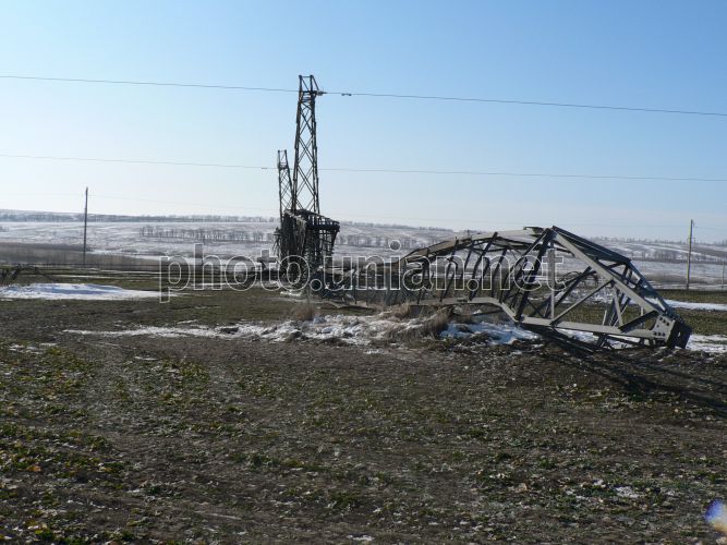Упавшая опора магистральной линии ВП-750 кВ «ЗАЭС-Южнодонбасская» в районе с. Качкаровка (Великобелозерский район, Запорожская область), 27 января 2012 г. Сотрудники правоохранительных органов задержали троих мужчин, которые 27 января в Великобелозерском районе Запорожской области в районе села Качкаровка разобрали металлическую конструкцию электроопоры. Тогда в ходе проверки было установлено, что на опоре № 77 (а также на двух соседних) частично отсутствуют металлические уголки и степ-болты, из-за чего опора упала на землю, что привело к короткому замыканию электросети и снижению мощности атомной станции на 40 МВт. Никто не пострадал, на общее состояние электроснабжения это не повлияло, перебоя в подаче электричества к пользователям не было. Для расследования этого преступления правоохранители создали усиленную следственно-оперативную группу, которая оперативно установила личности подозреваемых в совершении преступления: троих местных жителей 1986, 1987 и 1978 года рождения. В отношении задержанных следственным управлением ГУМВД Украины в Запорожской области возбуждено уголовное дело по признакам преступления, предусмотренного ч.2 ст. 194 -1 УК Украины «Умышленное повреждение объектов электроэнергетики». Фото предоставлено главным инженером Национальной энергетической компании «Укрэнерго» Днепровской энергетической системы «Запорожские магистральные сети» Василием Федорончаком / УНИАН