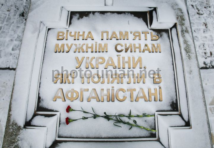 Надпись на памятнике погибшим воинам-афганцам "Вечная память мужественным сынам, которые погибли в Афганистане", в Киеве, во вторник, 14 февраля 2012 г. 15 февраля, согласно Указу Президента Украины, в Украине отмечают День чествования участников боевых действий на территории других государств. В этот день в 1989 году последнее подразделение 40-й армии СССР покинуло Афганистан. В войне в Афганистане принимали участие почти 170 тысяч украинцев. По официальным данным, погибли 13 тыс. 100 лиц, но, по словам «афганцев», их намного больше: ведь в первые годы войны запрещали даже на надгробиях писать, что человек погиб во время выполнения интернационального долга. Фото Владимира Гонтара / УНИАН