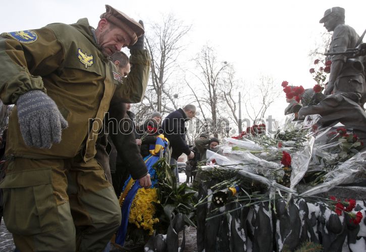 Воин-интернационалист во время возложения цветов к Мемориальному комплексу погибшим в Афганистане гражданам Украины по случаю Дня чествования памяти участников боевых действий на территории других государств и 23-й годовщины вывода войск бывшего СССР из Республики Афганистан, в Киеве, в среду, 15 февраля 2012 г. 15 февраля, согласно Указу Президента Украины, в Украине отмечают День чествования участников боевых действий на территории других государств. В этот день в 1989 году последнее подразделение 40-й армии СССР покинуло Афганистан. В войне в Афганистане принимали участие почти 170 тысяч украинцев. По официальным данным, погибли 13 тыс. 100 лиц, но, по словам «афганцев», их намного больше: ведь в первые годы войны запрещали даже на надгробиях писать, что человек погиб во время выполнения интернационального долга. Фото УНИАН
