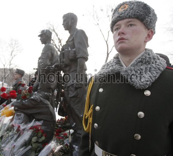 Военнослужащий роты почётного караула во время возложения цветов к Мемориальному комплексу погибшим в Афганистане гражданам Украины по случаю Дня чествования памяти участников боевых действий на территории других государств и 23-й годовщины вывода войск бывшего СССР из Республики Афганистан, в Киеве, в среду, 15 февраля 2012 г. 15 февраля, согласно Указу Президента Украины, в Украине отмечают День чествования участников боевых действий на территории других государств. В этот день в 1989 году последнее подразделение 40-й армии СССР покинуло Афганистан. В войне в Афганистане принимали участие почти 170 тысяч украинцев. По официальным данным, погибли 13 тыс. 100 лиц. Фото УНИАН
