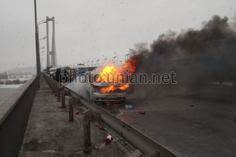 Горящий автомобиль марки Chevrolet Lacetti на Южном мосту в Киеве, во вторник, 28 февраля 2012 г. В этот день утром на Южном мосту в Киеве пылало авто. Предварительно, машина загорелась из-за технической неисправности. Водители, проезжавшие мимо горящего авто, останавливали свои машины, доставали огнетушители и пытались потушить пламя. Автомобиль сгорел почти полностью. В результате ЧП на мосту образовалась пробка. Фото Владимира Патланя / УНИАН