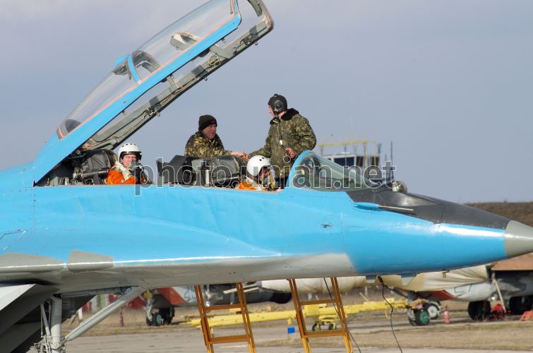 Лётчики Севастопольской бригады тактической авиации Воздушных Сил Вооруженных Сил Украины готовятся к тренировочному полету, в Севастополе (Крым), в пятницу, 16 марта 2012 г. В рамках подготовки к Евро 2012 в Севастопольской бригаде тактической авиации прошли тренировочные полеты. Фото Василия Батанова / УНИАН