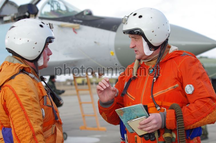 Лётчики Севастопольской бригады тактической авиации Воздушных Сил Вооруженных Сил Украины перед началом тренировочных полетов, в Севастополе (Крым), в пятницу, 16 марта 2012 г. В рамках подготовки к Евро 2012 в Севастопольской бригаде тактической авиации прошли тренировочные полеты. Фото Василия Батанова / УНИАН